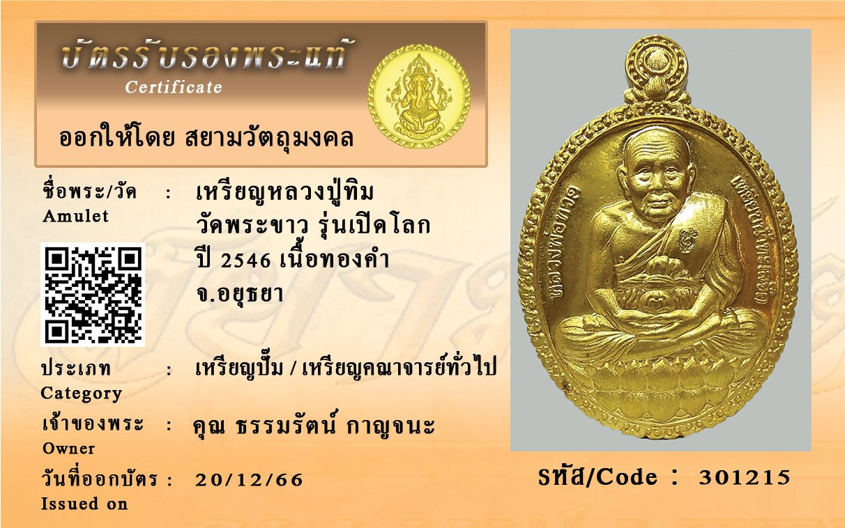 รหัสสินค้า : 301215 เหรียญหลวงปู่ทิม วัดพระขาว รุ่นเปิดโลก ปี 2546 เนื้อทองคำ จ.อยุธยา