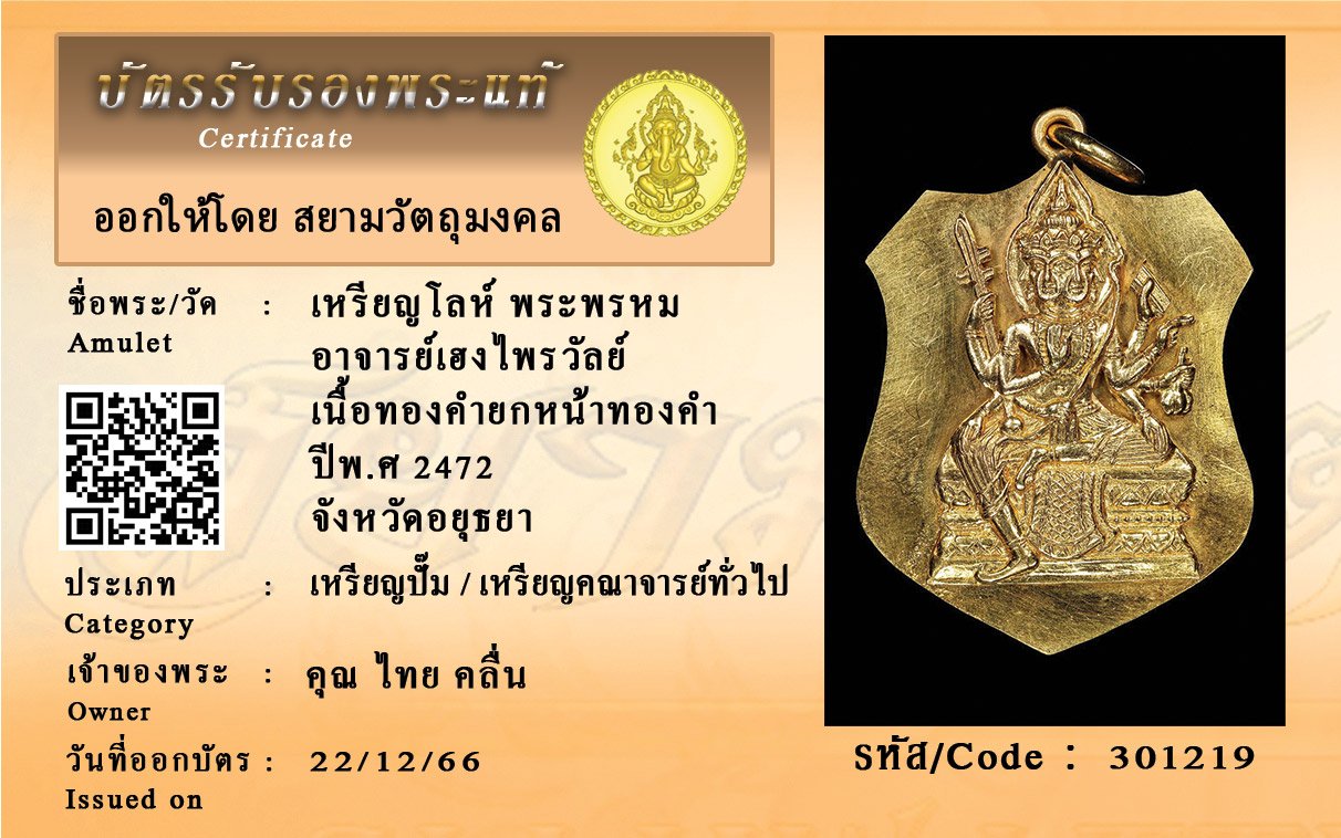 รหัสสินค้า : 301219 เหรียญโลห์ พระพรหม อาจารย์เฮงไพรวัลย์ เนื้อทองคำยกหน้าทองคำ ปีพ.ศ 2472 จังหวัดอยุธยา