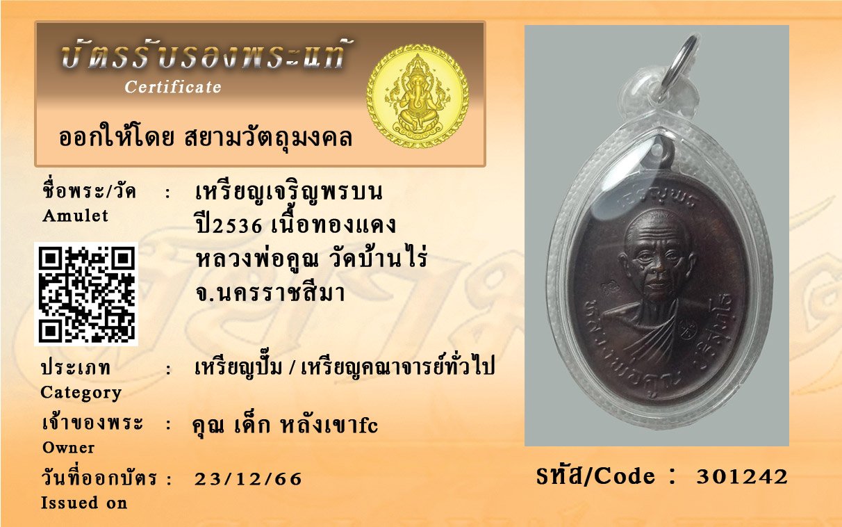 รหัสสินค้า : 301242 เหรียญเจริญพรบน ปี2536 เนื้อทองแดง หลวงพ่อคูณ วัดบ้านไร่ จ.นครราชสีมา