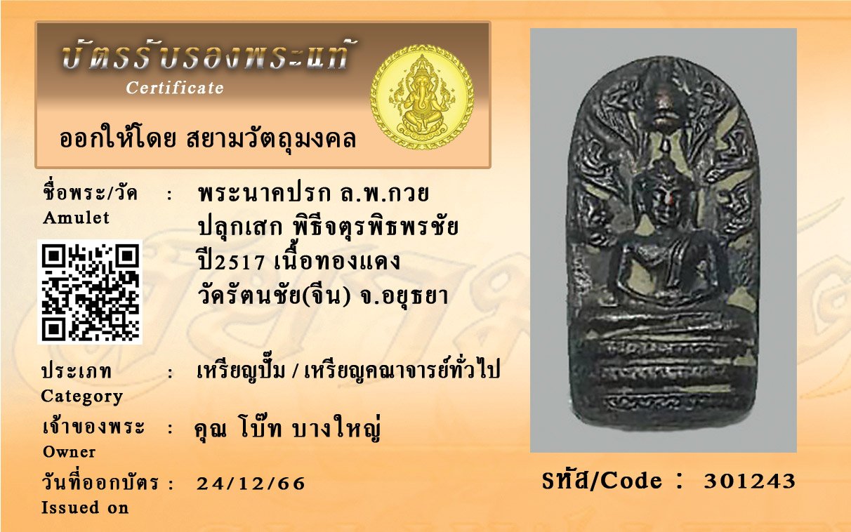 รหัสสินค้า : 301243 พระนาคปรก ล.พ.กวย ปลุกเสก พิธีจตุรพิธพรชัย ปี2517 เนื้อทองแดง วัดรัตนชัย(จีน) จ.อยุธยา