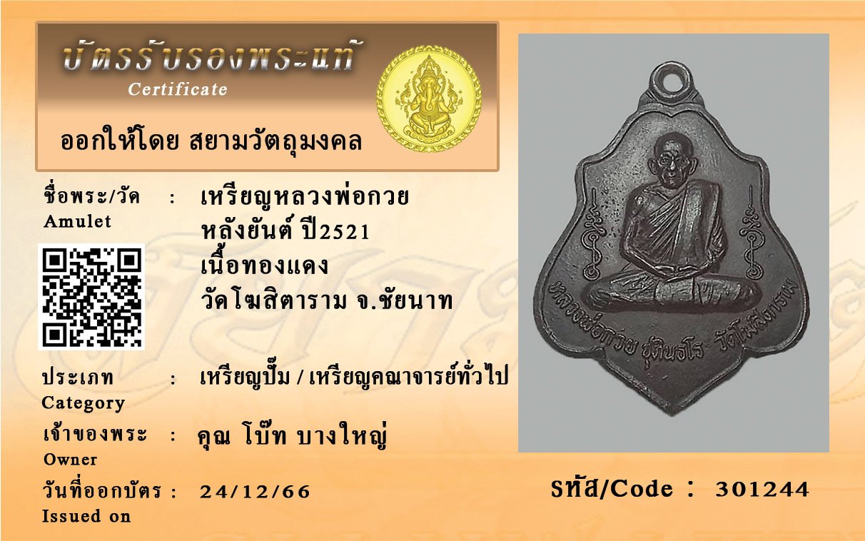 รหัสสินค้า : 301244 เหรียญหลวงพ่อกวย หลังยันต์ ปี2521 เนื้อทองแดง วัดโฆสิตาราม จ.ชัยนาท