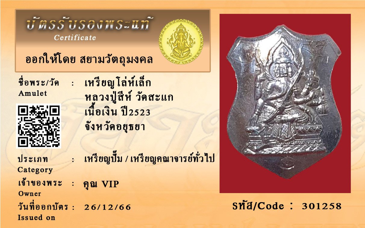 รหัสสินค้า : 301258 เหรียญโล่ห์เล็ก หลวงปู่สีห์ วัดสะแก เนื้อเงิน ปี2523 จังหวัดอยุธยา