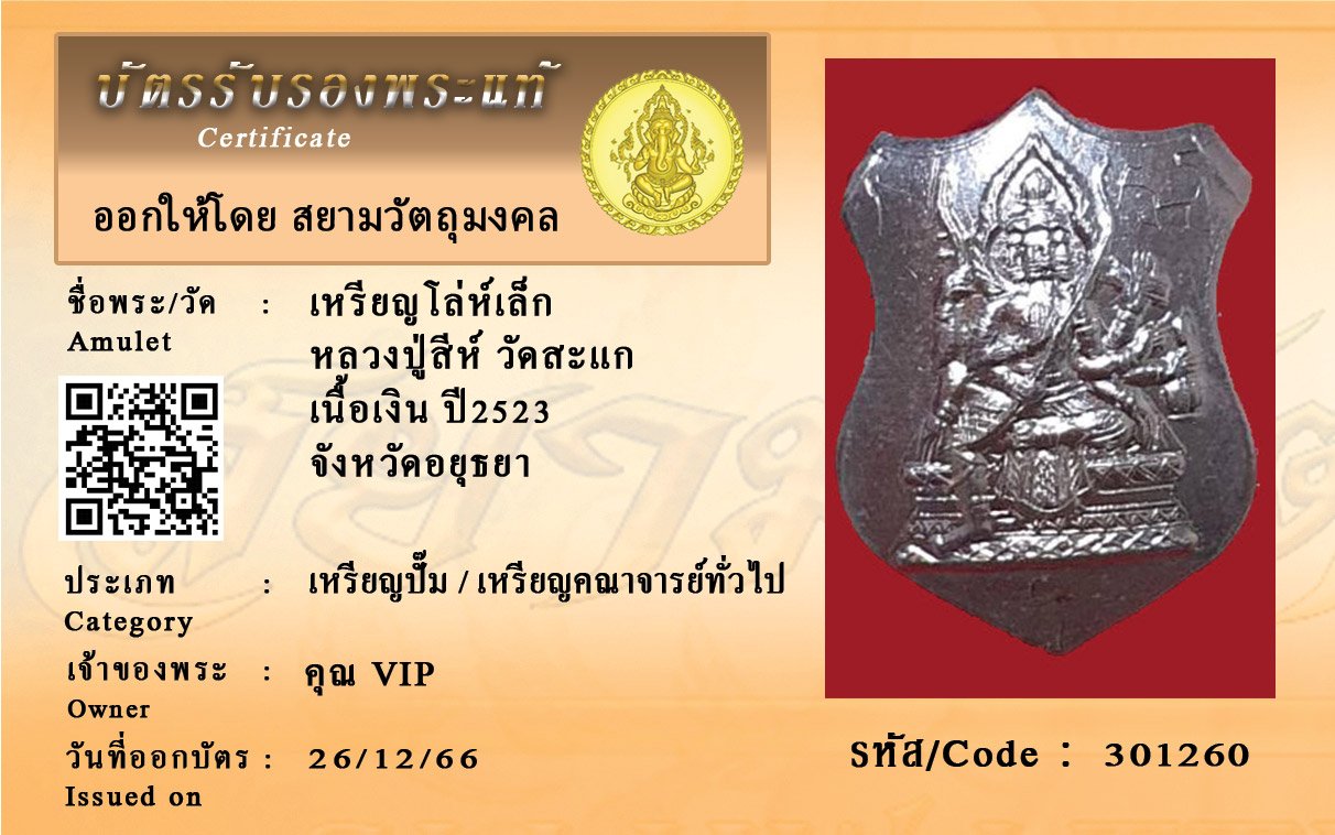 รหัสสินค้า : 301260 เหรียญโล่ห์เล็ก หลวงปู่สีห์ วัดสะแก เนื้อเงิน ปี2523 จังหวัดอยุธยา