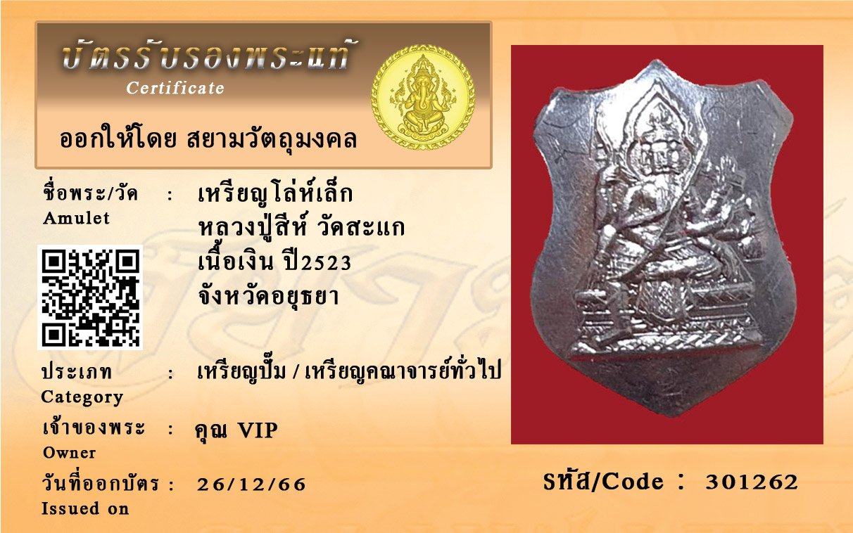 รหัสสินค้า : 301262 เหรียญโล่ห์เล็ก หลวงปู่สีห์ วัดสะแก เนื้อเงิน ปี2523 จังหวัดอยุธยา