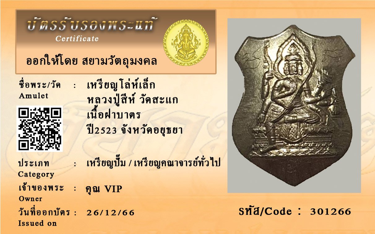รหัสสินค้า : 301266 เหรียญโล่ห์เล็ก หลวงปู่สีห์ วัดสะแก เนื้อฝาบาตร ปี2523 จังหวัดอยุธยา