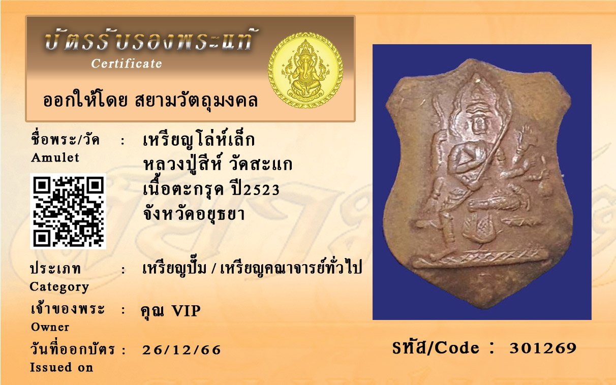 รหัสสินค้า : 301269 เหรียญโล่ห์เล็ก หลวงปู่สีห์ วัดสะแก เนื้อตะกรุด ปี2523 จังหวัดอยุธยา