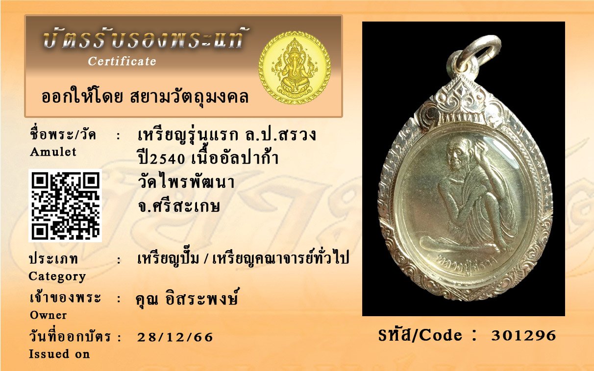 รหัสสินค้า : 301296 เหรียญรุ่นแรก ปี2540 เนื้ออัลปาก้า ล.ป.สรวง วัดไพรพัฒนา จ.ศรีสะเกษ
