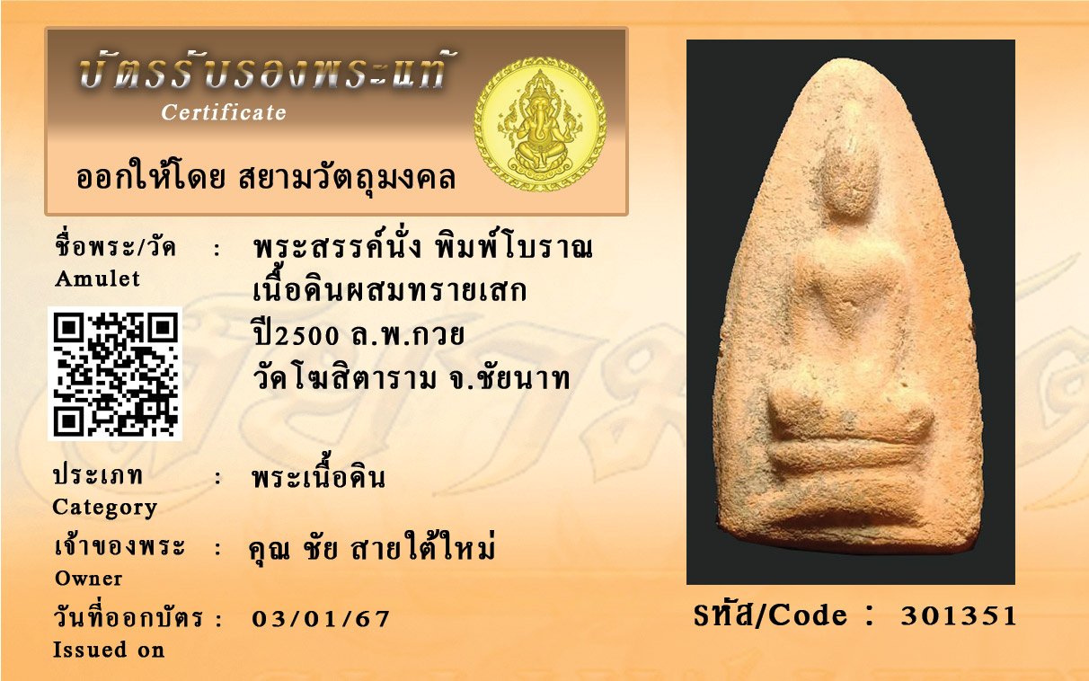 รหัสสินค้า : 301351 พระสรรค์นั่ง พิมพ์โบราณ เนื้อดินผสมทรายเสก ปี2500 ล.พ.กวย วัดโฆสิตาราม จ.ชัยนาท