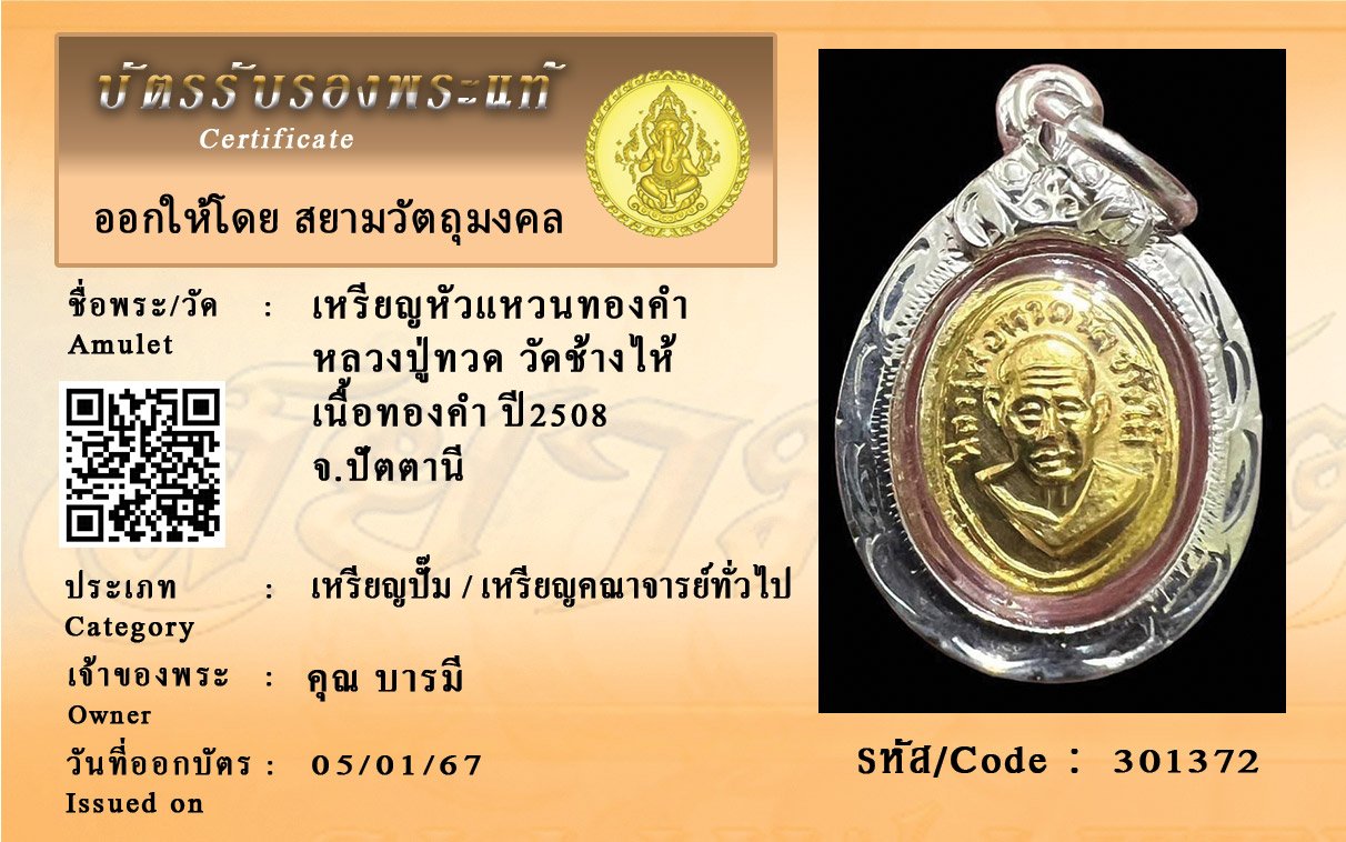 รหัสสินค้า : 301372 เหรียญหัวแหวนทองคำ หลวงปู่ทวด วัดช้างไห้ เนื้อทองคำ ปี2508 จ.ปัตตานี