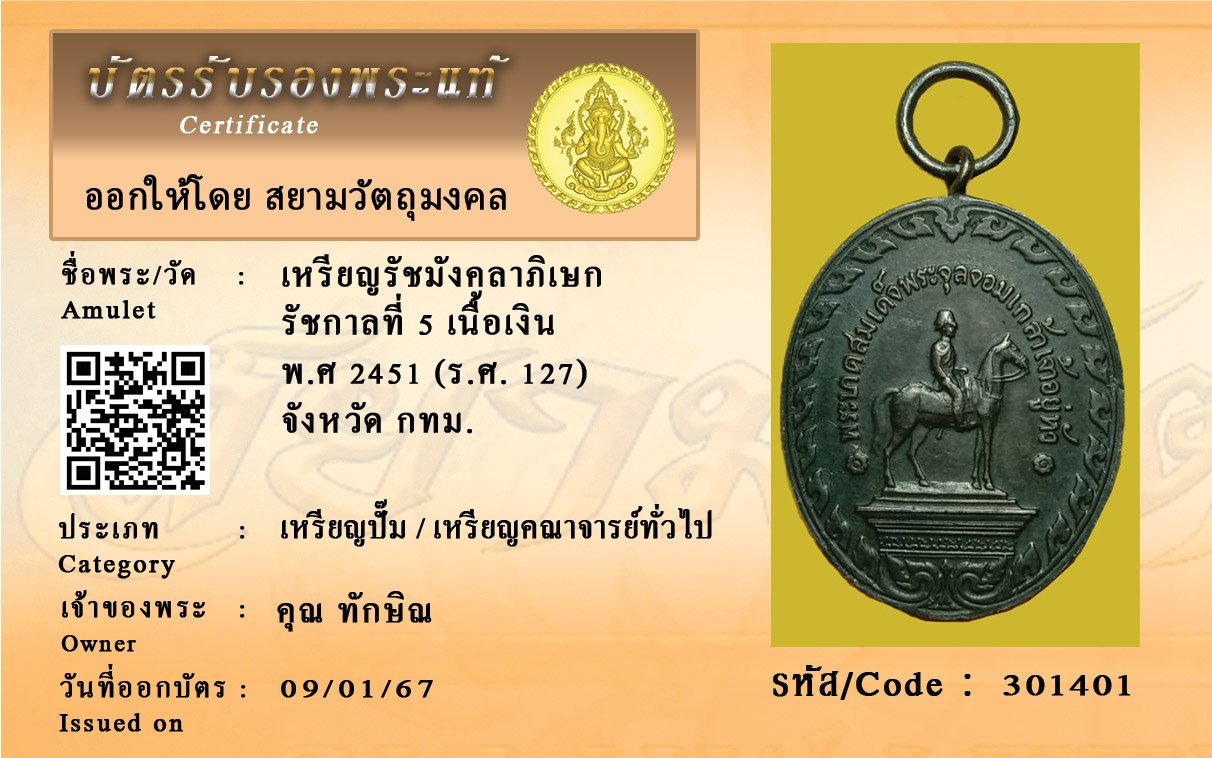รหัสสินค้า : 301401 เหรียญรัชมังคลาภิเษก รัชกาลที่ 5 เนื้อเงิน พ.ศ 2451 (ร.ศ. 127) จังหวัด กทม.