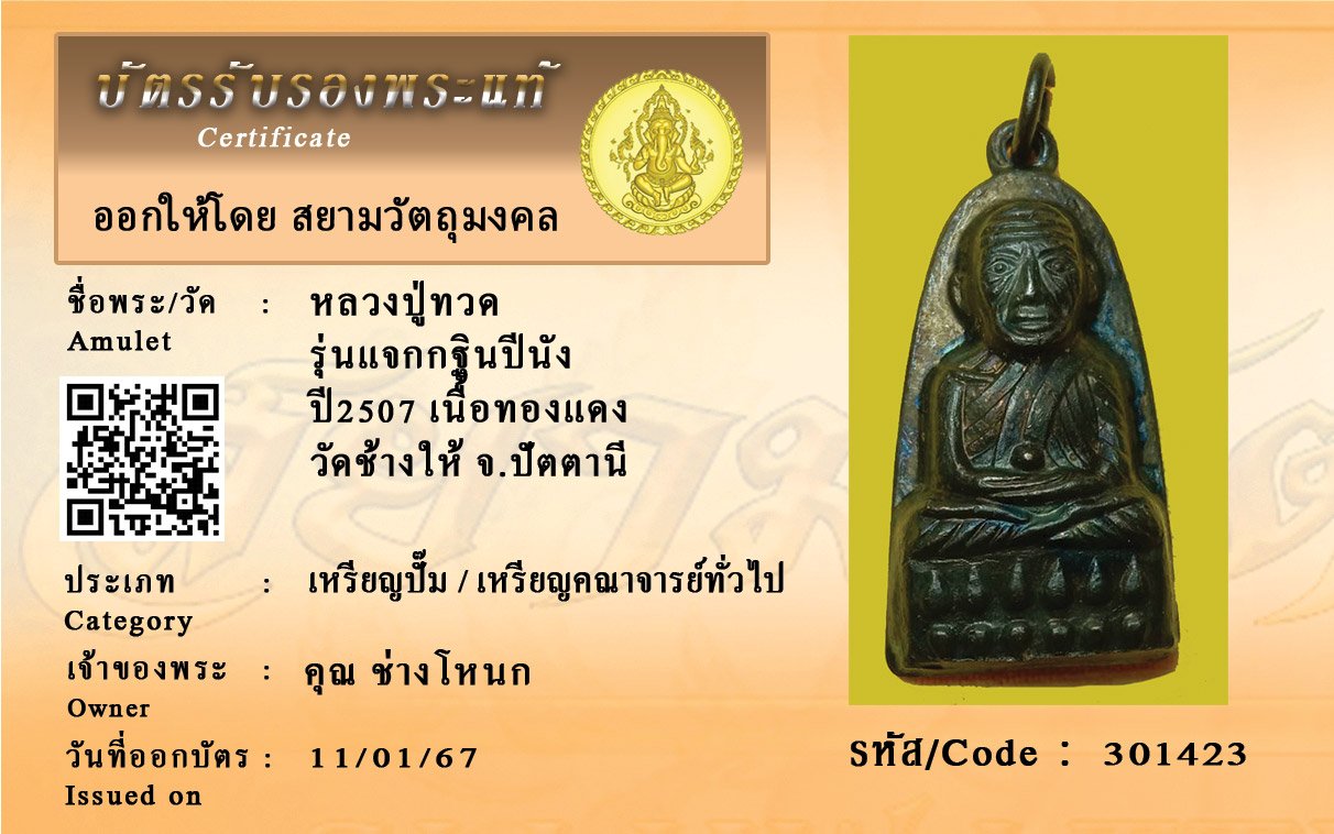รหัสสินค้า : 301423 หลวงปู่ทวด รุ่นแจกกฐินปีนัง ปี2507 เนื้อทองแดง วัดช้างให้ จ.ปัตตานี