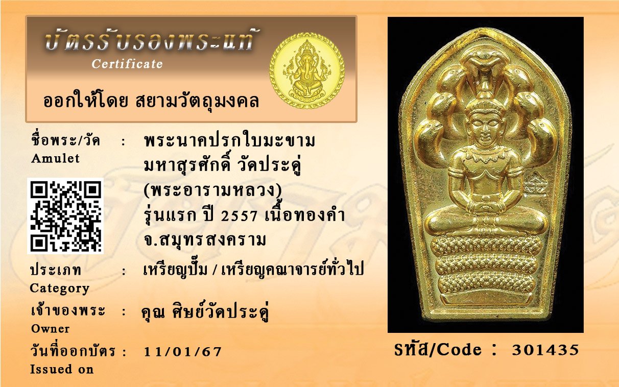 รหัสสินค้า : 301435 พระนาคปรกใบมะขาม มหาสุรศักดิ์ วัดประดู่ (พระอารามหลวง) รุ่นแรก ปี 2557 เนื้อทองคำ จ.สมุทรสงคราม