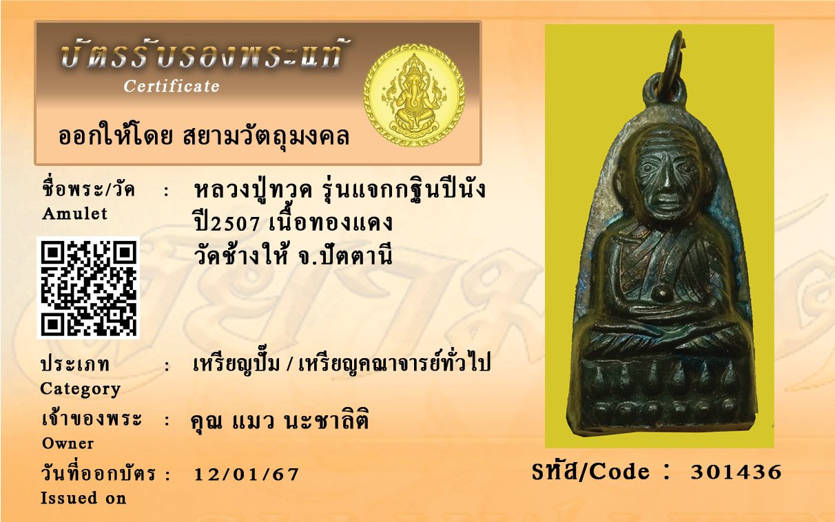 รหัสสินค้า : 301436 หลวงปู่ทวด รุ่นแจกกฐินปีนัง ปี2507 เนื้อทองแดง วัดช้างให้ จ.ปัตตานี