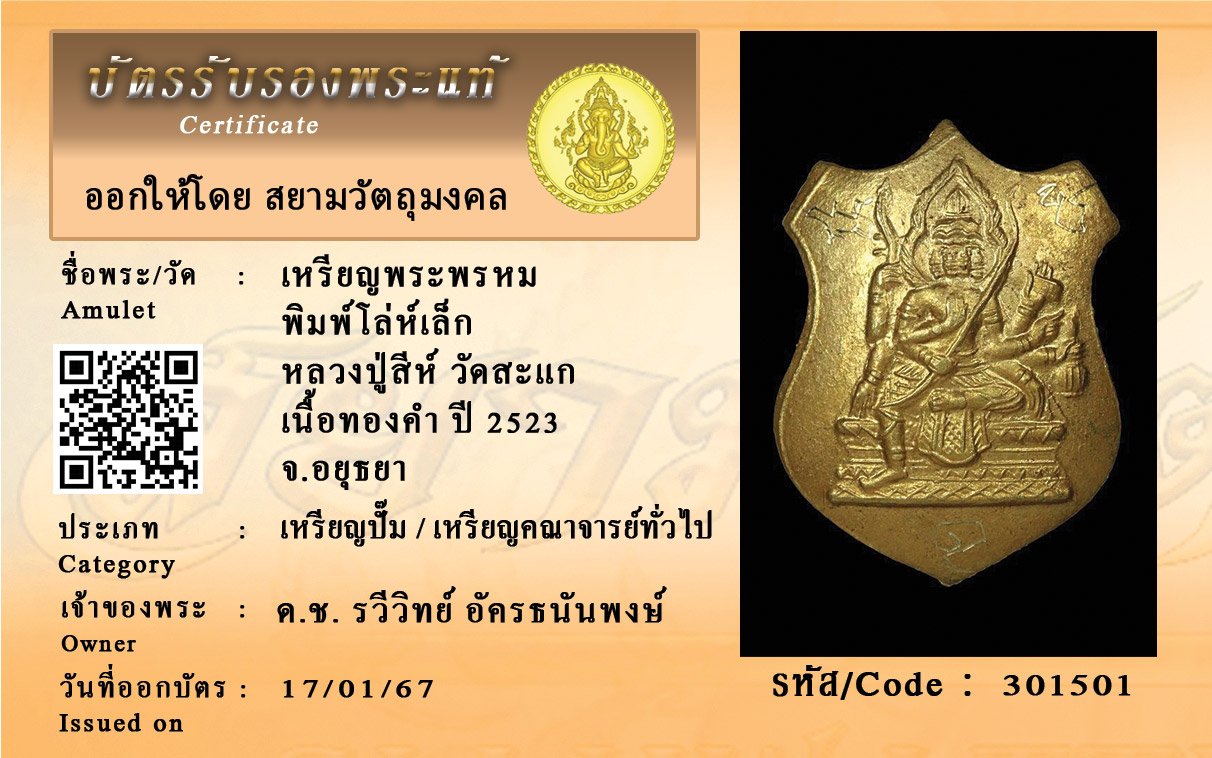 รหัสสินค้า : 301501 เหรียญพระพรหม พิมพ์โล่ห์เล็ก หลวงปู่สีห์ วัดสะแก เนื้อทองคำ ปี 2523 จ.อยุธยา