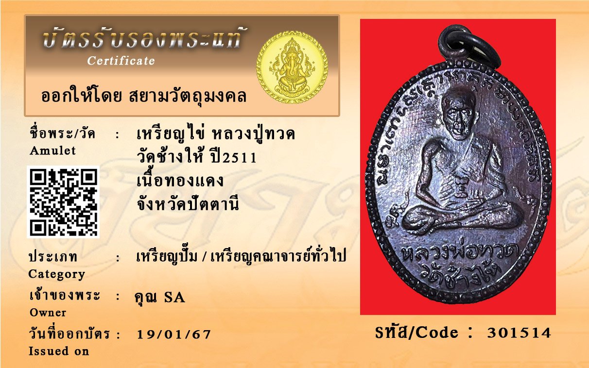 รหัสสินค้า : 301514 เหรียญไข่ หลวงปู่ทวด วัดช้างให้ ปี2511 เนื้อทองแดง จังหวัดปัตตานี