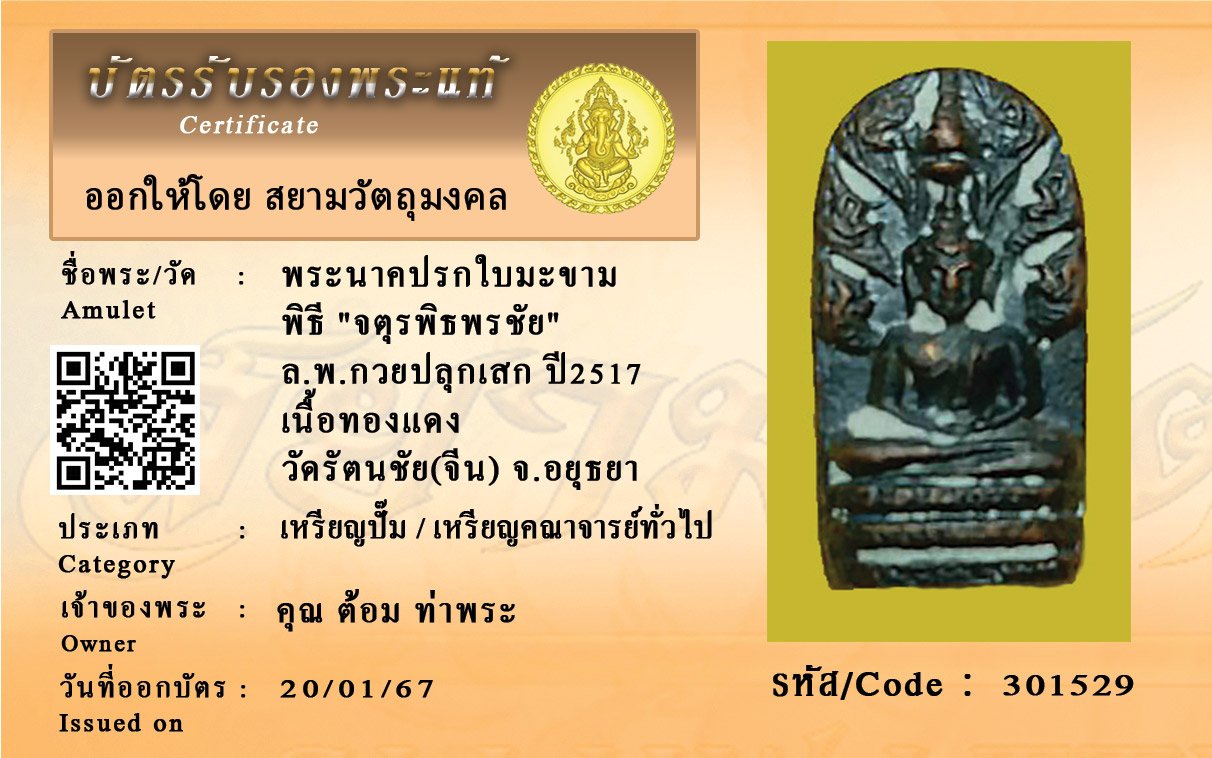 รหัสสินค้า : 301529 พระนาคปรกใบมะขาม พิธี "จตุรพิธพรชัย" ล.พ.กวยปลุกเสก ปี2517 เนื้อทองแดง วัดรัตนชัย(จีน) จ.อยุธยา