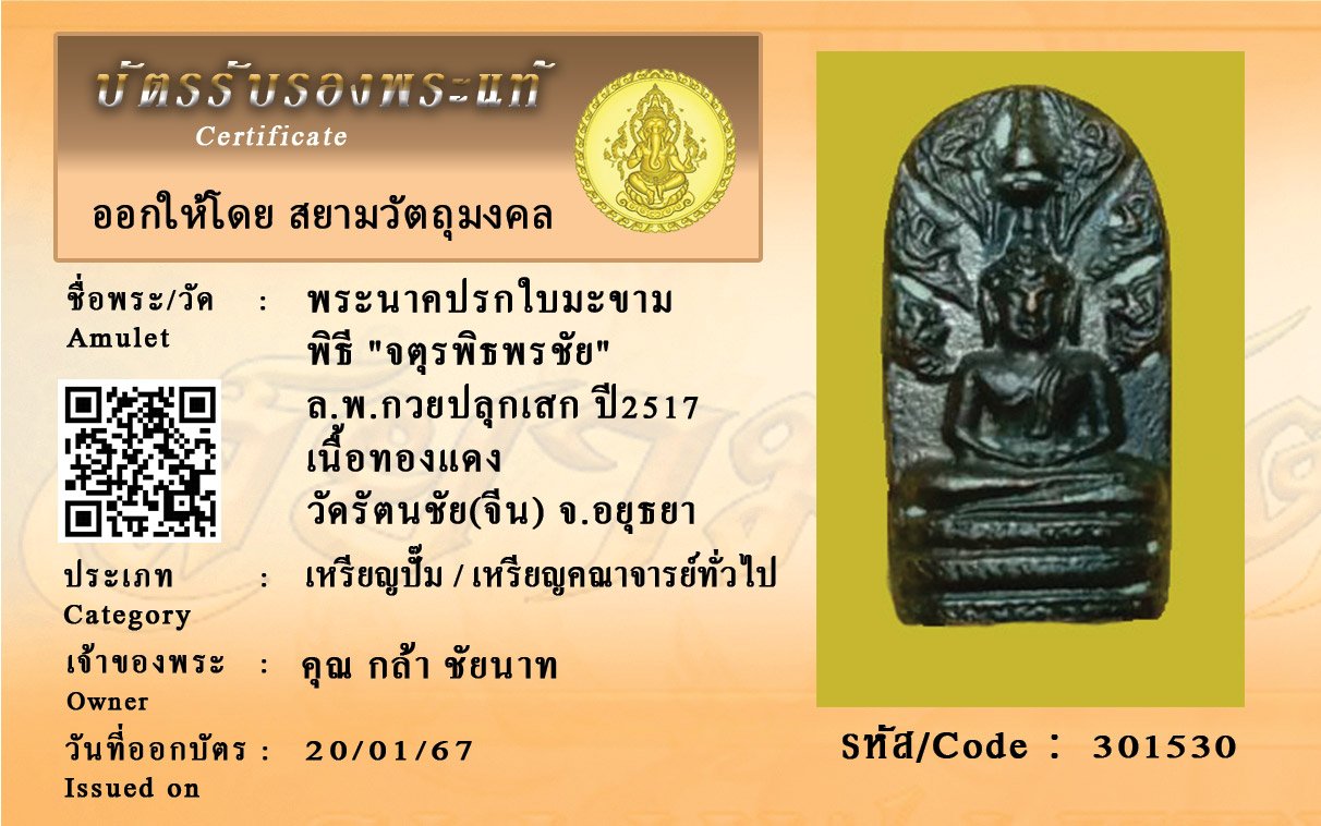 รหัสสินค้า : 301530 พระนาคปรกใบมะขาม พิธี "จตุรพิธพรชัย" ล.พ.กวยปลุกเสก. ปี2517 เนื้อทองแดง วัดรัตนชัย(จีน) จ.อยุธยา