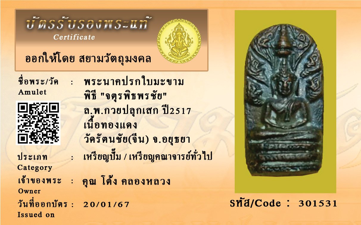 รหัสสินค้า : 301531 พระนาคปรกใบมะขาม พิธี "จตุรพิธพรชัย" ล.พ.กวยปลุกเสก ปี2517 เนื้อทองแดง วัดรัตนชัย(จีน) จ.อยุธยา