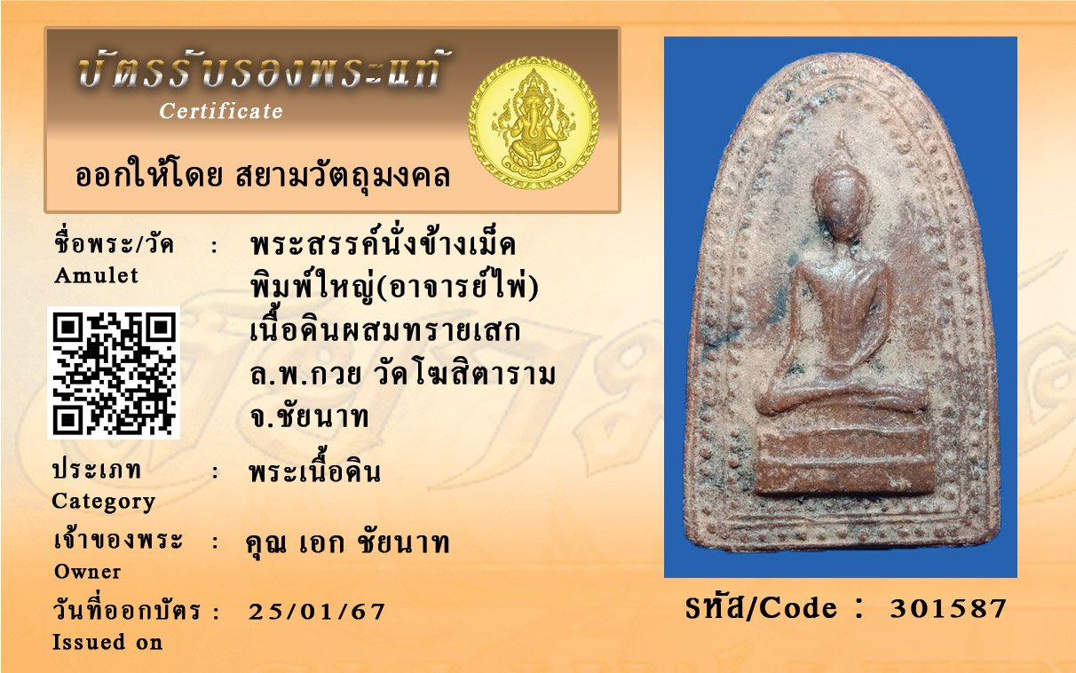 รหัสสินค้า : 301587 พระสรรค์นั่งข้างเม็ด พิมพ์ใหญ่(อาจารย์ไพ่) เนื้อดินผสมทรายเสก ล.พ.กวย วัดโฆสิตาราม จ.ชัยนาท
