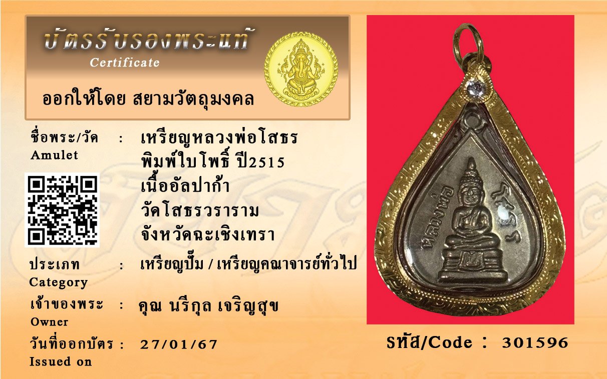 รหัสสินค้า : 301596 เหรียญหลวงพ่อโสธร พิมพ์ใบโพธิ์ ปี2515 เนื้ออัลปาก้า วัดโสธรวราราม จังหวัดฉะเชิงเทรา