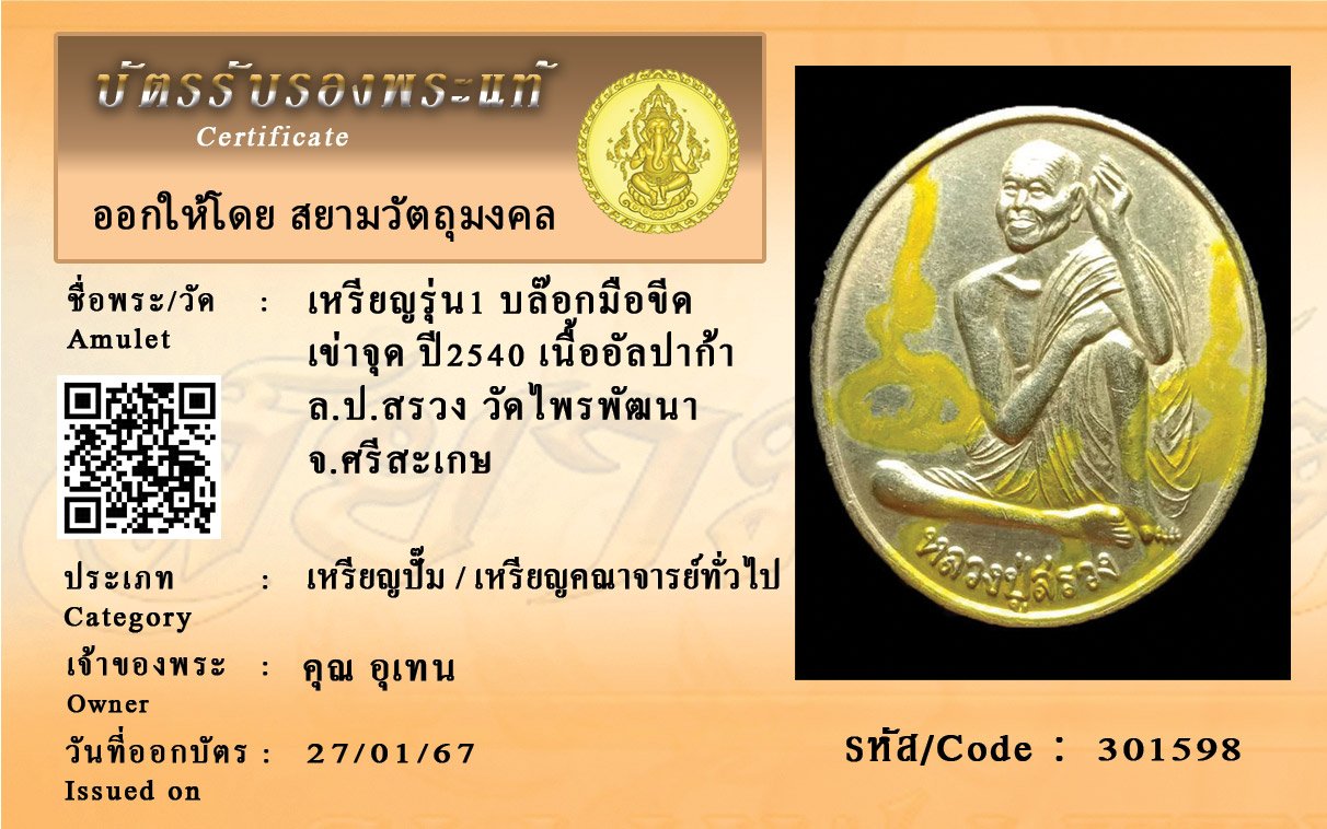 รหัสสินค้า : 301598 เหรียญรุ่น1 บล๊อกมือขีด เข่าจุด ปี2540 เนื้ออัลปาก้า ล.ป.สรวง วัดไพรพัฒนา จ.ศรีสะเกษ
