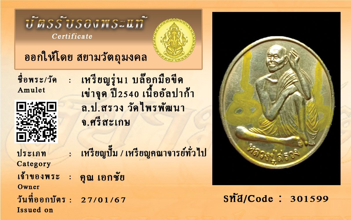 รหัสสินค้า : 301599 เหรียญรุ่น1 บล๊อกมือขีด เข่าจุด ปี2540 เนื้ออัลปาก้า ล.ป.สรวง วัดไพรพัฒนา จ.ศรีสะเกษ