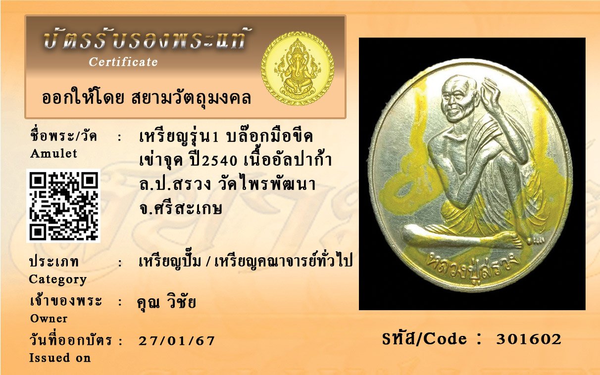 รหัสสินค้า : 301602 เหรียญรุ่น1 บล๊อกมือขีด เข่าจุด ปี2540 เนื้ออัลปาก้า ล.ป.สรวง วัดไพรพัฒนา จ.ศรีสะเกษ