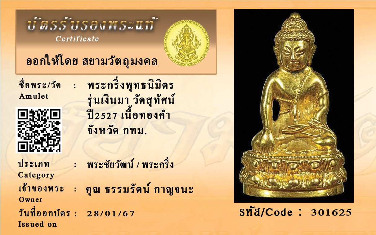 รหัสสินค้า : 301625 พระกริ่งพุทธนิมิตร รุ่นเงินมา วัดสุทัศน์ ปี2527 เนื้อทองคำ จังหวัด กทม.