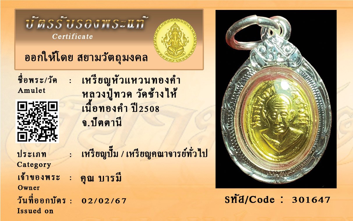 รหัสสินค้า : 301647 เหรียญหัวแหวนทองคำ หลวงปู่ทวด วัดช้างไห้ เนื้อทองคำ ปี2508 จ.ปัตตานี