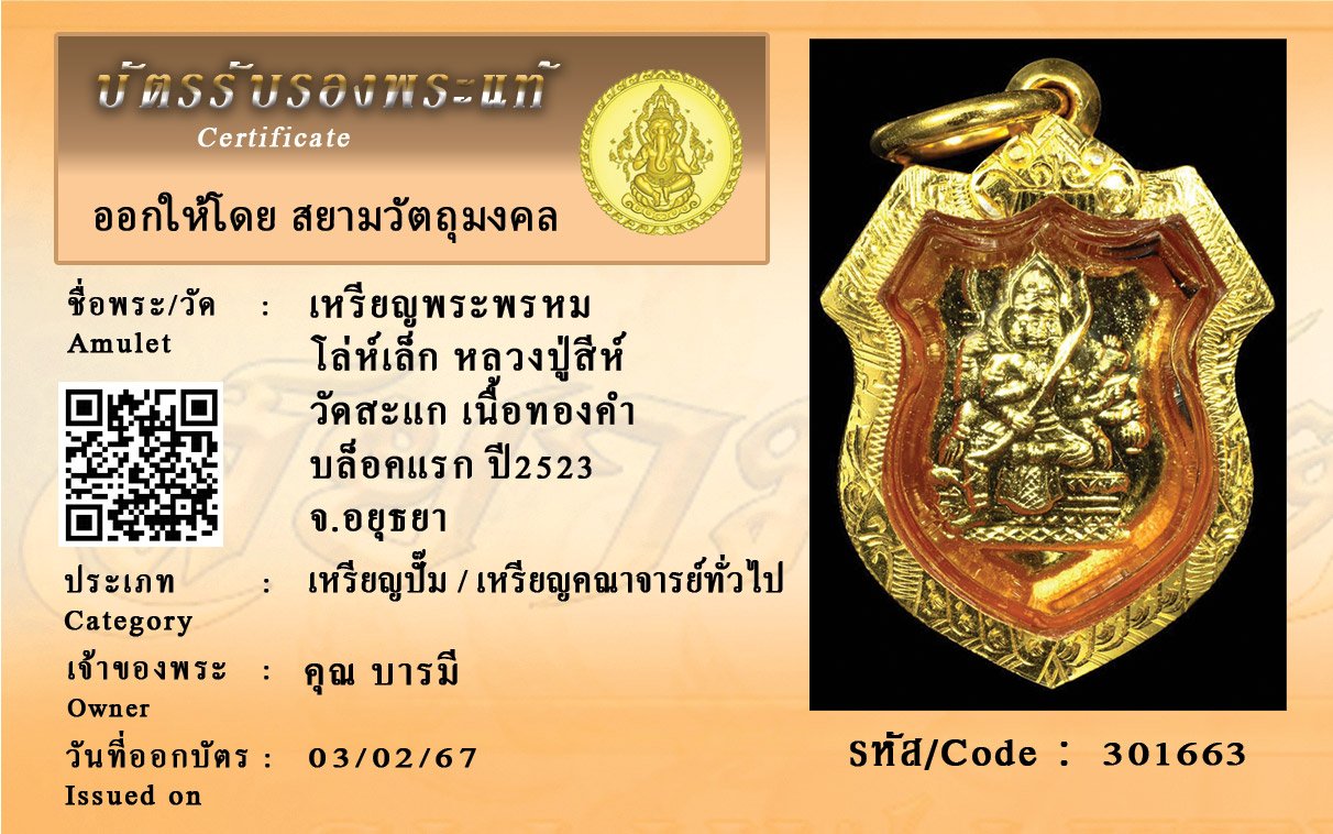 รหัสสินค้า : 301663 เหรียญพระพรหม โล่ห์เล็ก หลวงปู่สีห์ วัดสะแก เนื้อทองคำ บล็อคแรก ปี2523 จ.อยุธยา