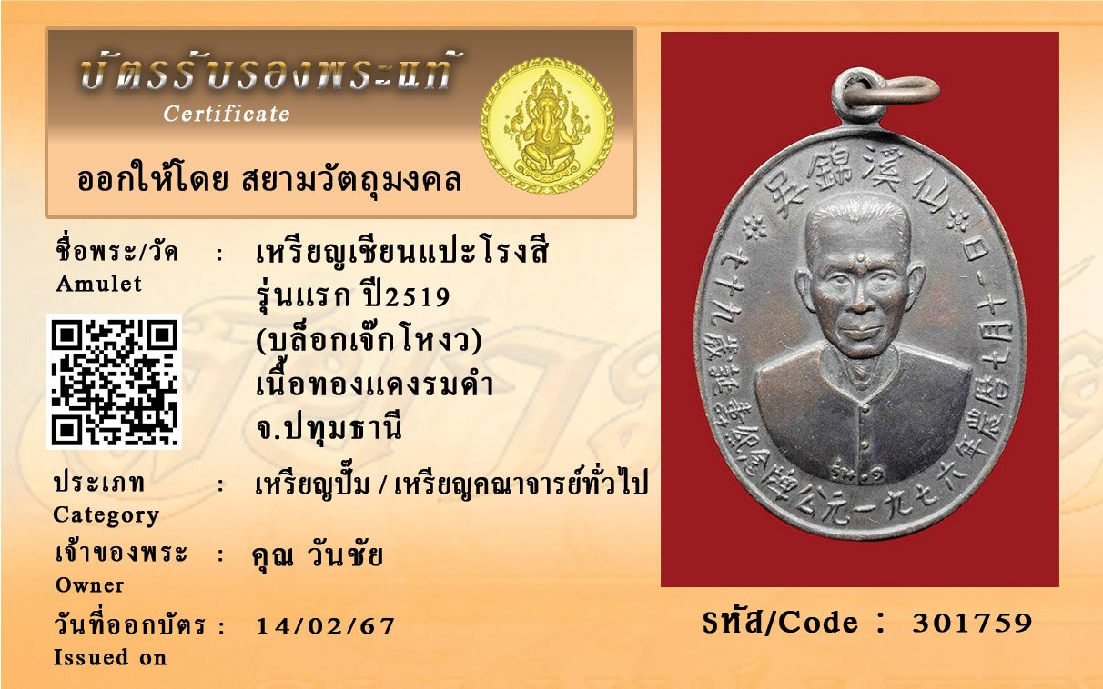รหัสสินค้า : 301759 เหรียญเชียนแปะโรงสี รุ่นเเรก ปี2519 (บล็อกเจ๊กโหงว) เนื้อทองเเดงรมดำ จ.ปทุมธานี