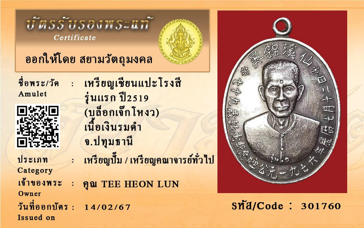 รหัสสินค้า : 301760 เหรียญเชียนแปะโรงสี รุ่นเเรก ปี2519 (บล็อกเจ๊กโหงว) เนื้อเงินรมดำ จ.ปทุมธานี