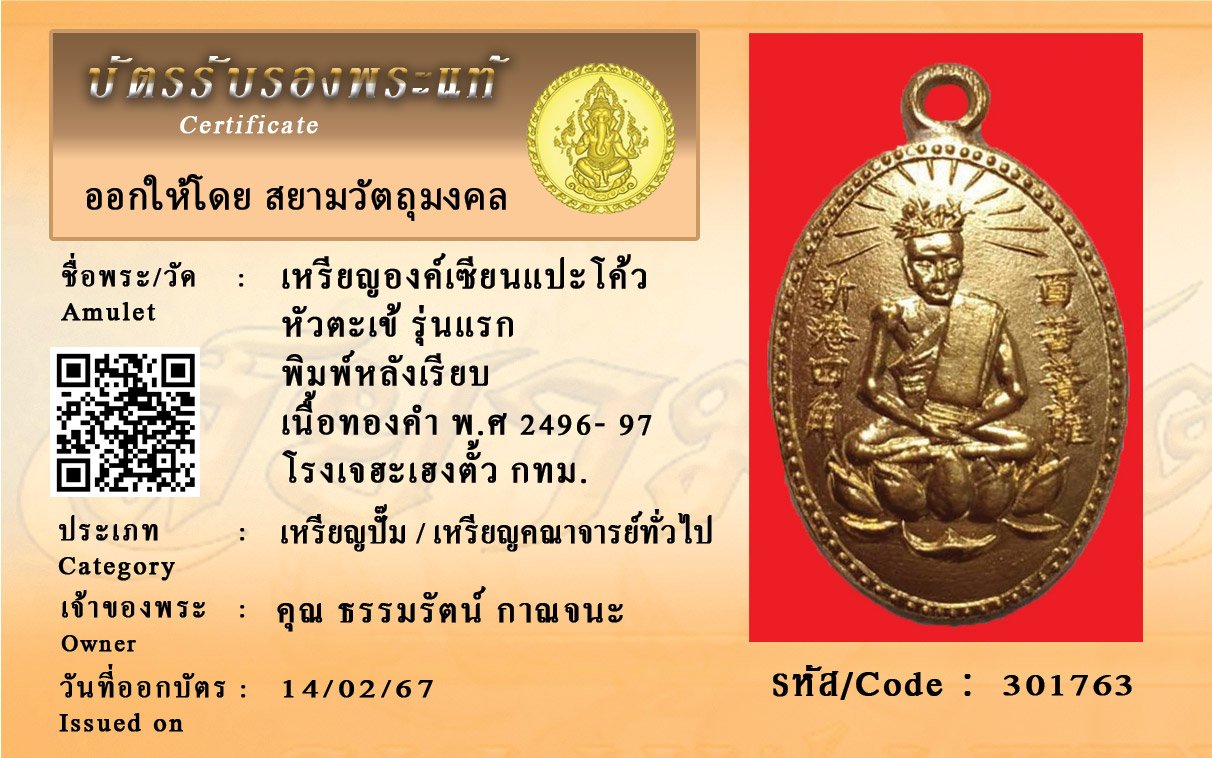 รหัสสินค้า : 301763 เหรียญองค์เซียนแปะโค้ว หัวตะเข้ รุ่นแรก พิมพ์หลังเรียบ เนื้อทองคำ พ.ศ 2496- 97 โรงเจฮะเฮงตั้ว กทม.
