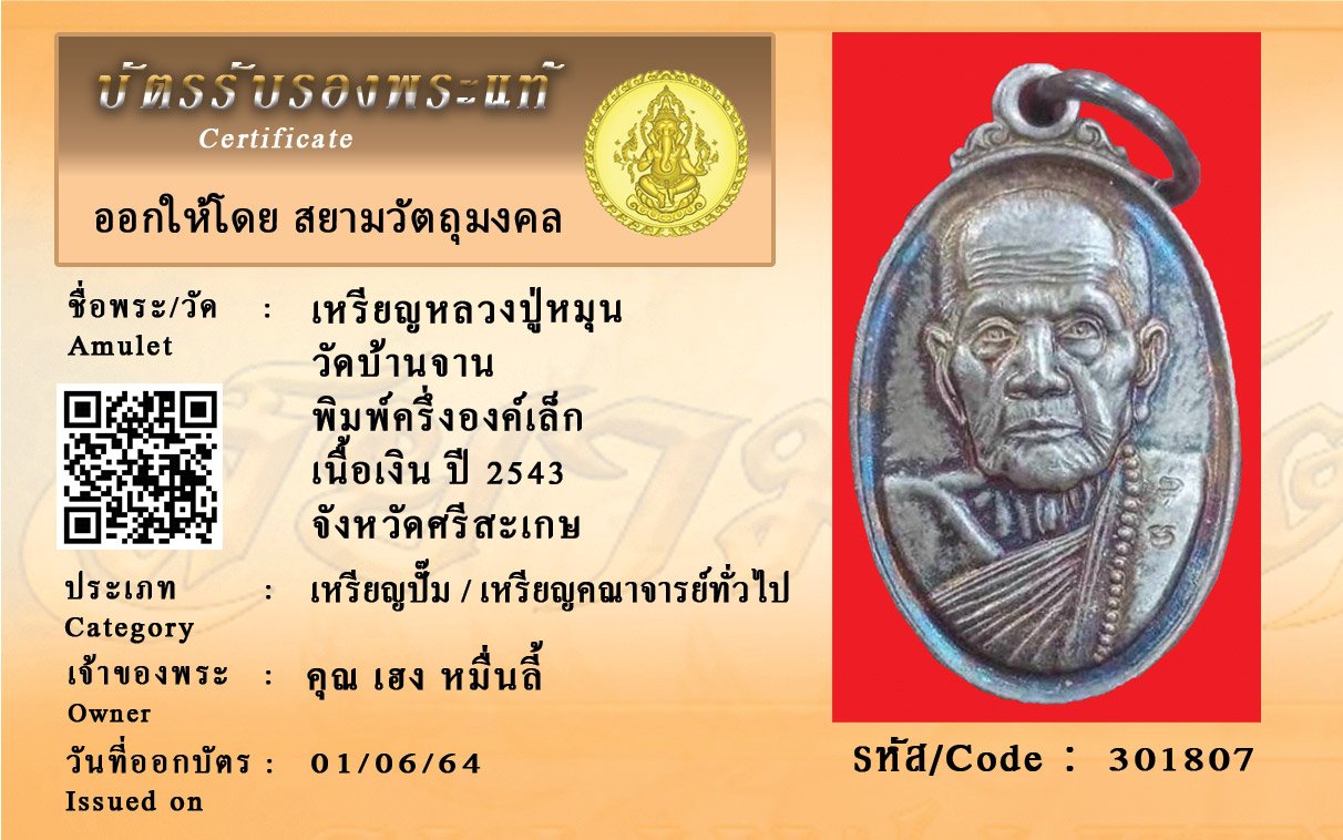 รหัสสินค้า : 301807 เหรียญหลวงปู่หมุน วัดบ้านจาน พิมพ์ครึ่งองค์เล็ก เนื้อเงิน ปี 2543 จังหวัดศรีสะเกษ