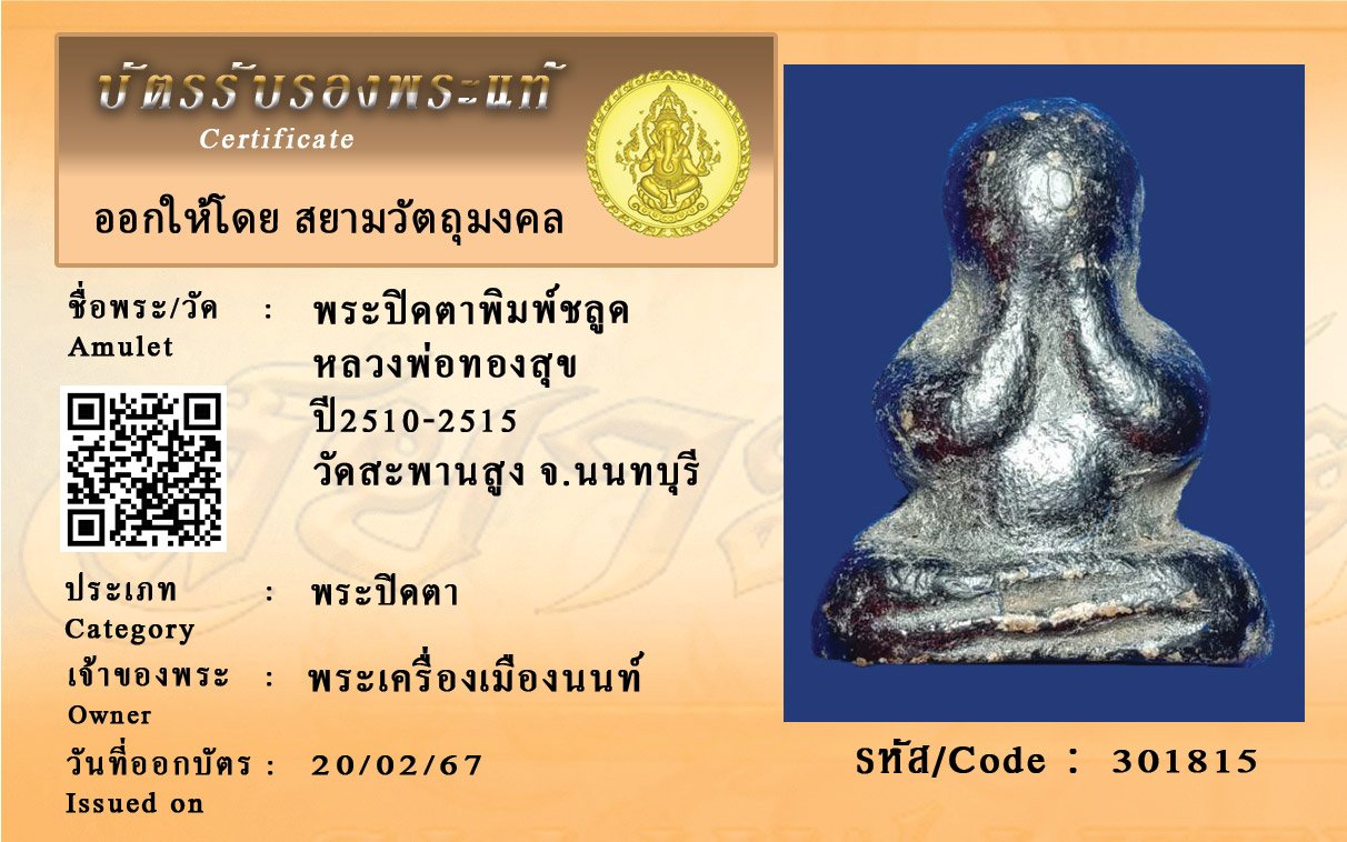 รหัสสินค้า : 301815 พระปิดตาพิมพ์ชลูด หลวงพ่อทองสุข ปี2510-2515 วัดสะพานสูง จ.นนทบุรี