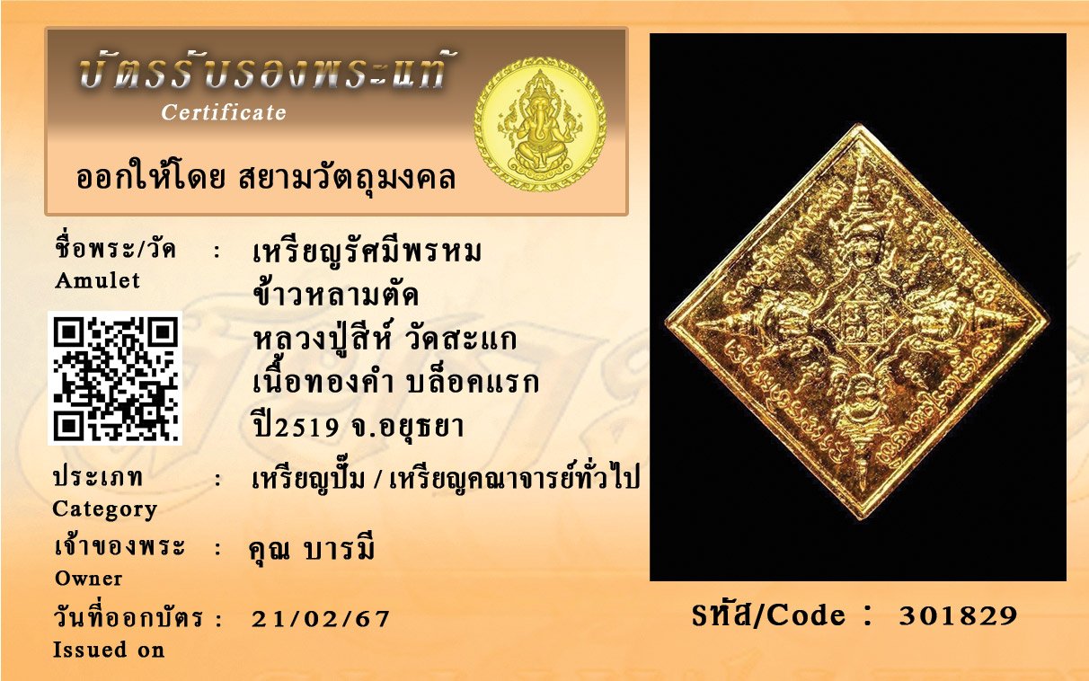 รหัสสินค้า : 301829 เหรียญรัศมีพรหม ข้าวหลามตัด หลวงปู่สีห์ วัดสะแก เนื้อทองคำ บล็อคแรก ปี2519 จ.อยุธยา