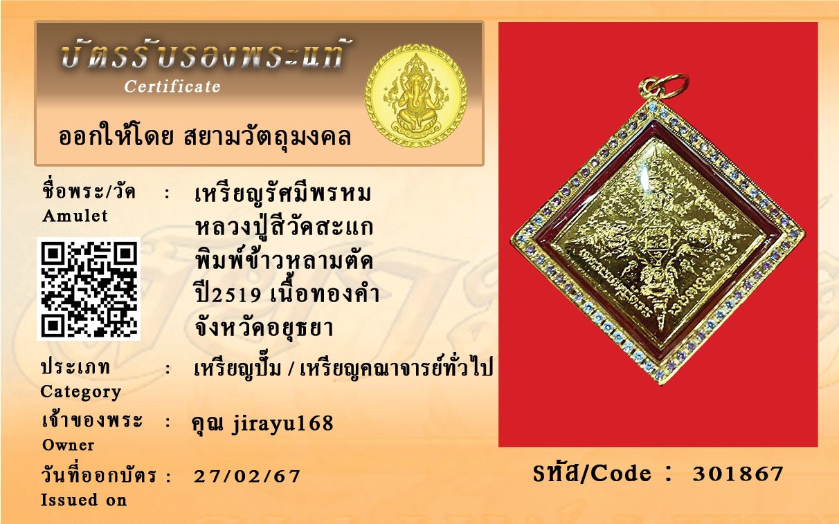 รหัสสินค้า : 301867 เหรียญรัศมีพรหม หลวงปู่สีวัดสะแก พิมพ์ข้าวหลามตัด ปี2519 เนื้อทองคำ จังหวัดอยุธยา