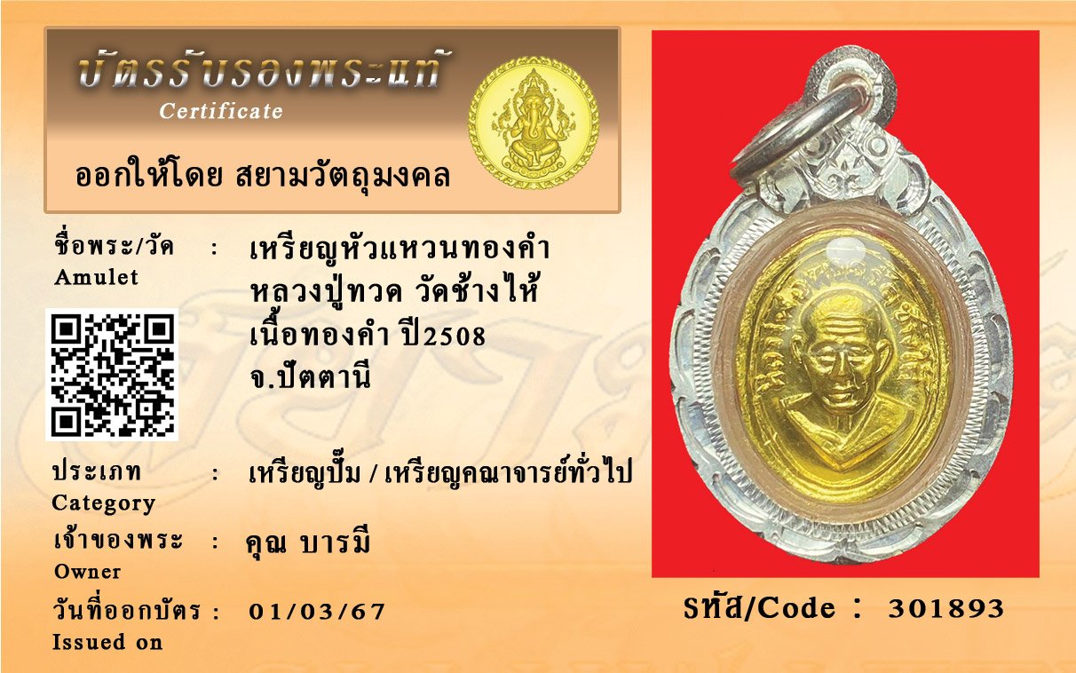 รหัสสินค้า : 301893 เหรียญหัวแหวนทองคำ หลวงปู่ทวด วัดช้างไห้ เนื้อทองคำ ปี2508 จ.ปัตตานี