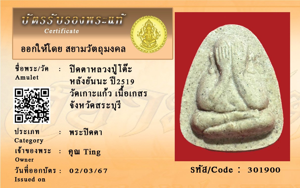 รหัสสินค้า : 301900 ปิดตาหลวงปู่โต๊ะ หลังยันนะ ปี2519 วัดเกาะแก้ว เนื้อเกสร จังหวัดสระบุรี
