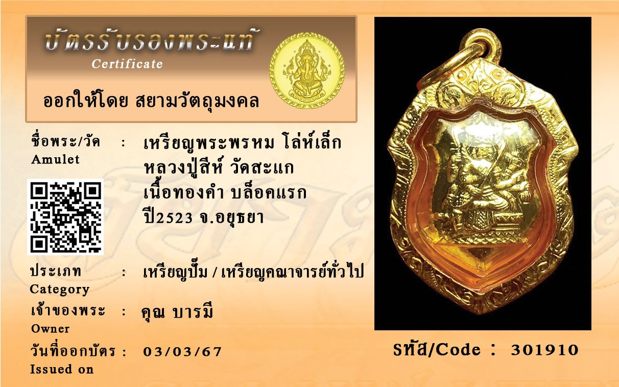 รหัสสินค้า : 301910 เหรียญพระพรหม โล่ห์เล็ก หลวงปู่สีห์ วัดสะแก เนื้อทองคำ บล็อคแรก ปี2523 จ.อยุธยา