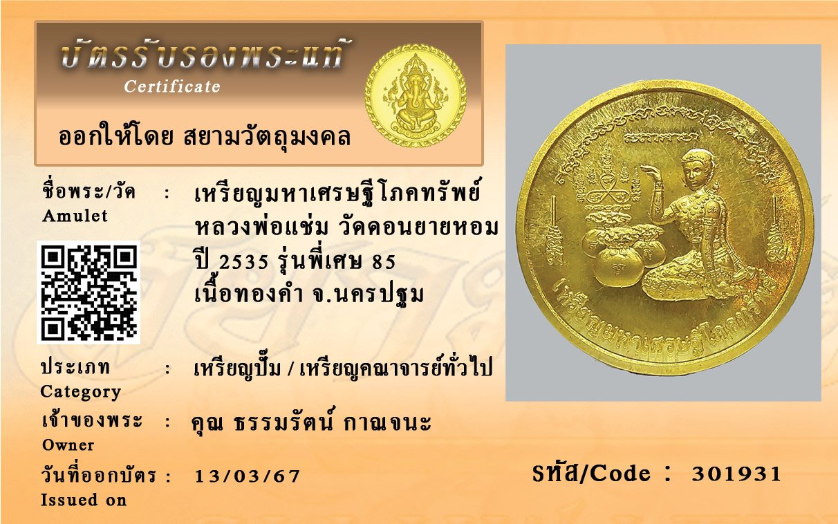 รหัสสินค้า : 301931 เหรียญมหาเศรษฐีโภคทรัพย์ หลวงพ่อแช่ม วัดดอนยายหอม ปี 2535 รุ่นพี่เศษ 85 เนื้อทองคำ จ.นครปฐม
