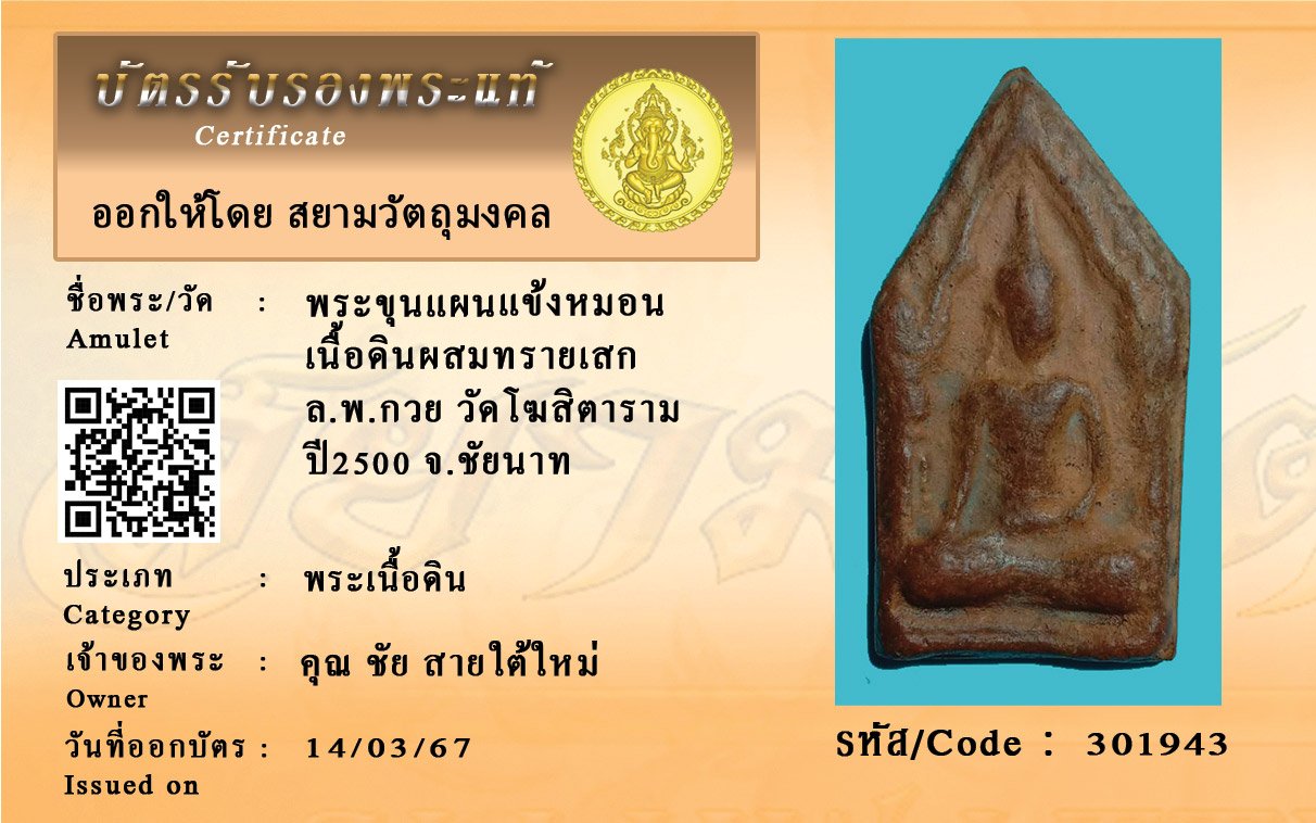 รหัสสินค้า : 301943 พระขุนแผนแข้งหมอน เนื้อดินผสมทรายเสก ล.พ.กวย วัดโฆสิตาราม ปี2500 จ.ชัยนาท