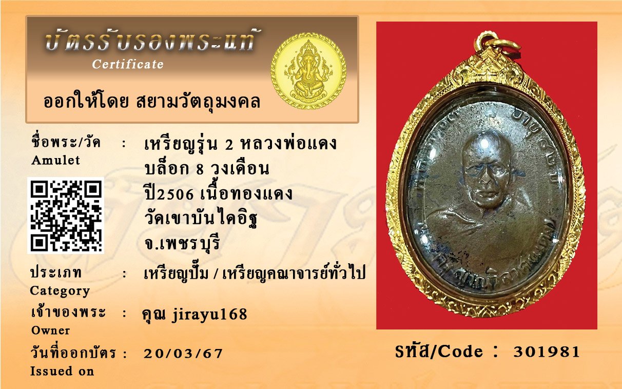 รหัสสินค้า : 301981 เหรียญรุ่น 2 หลวงพ่อแดง บล็อก 8 วงเดือน ปี2506 เนื้อทองแดง วัดเขาบันไดอิฐ จ.เพชรบุรี