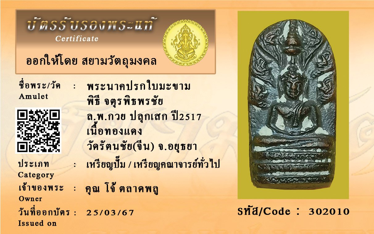 รหัสสินค้า : 302010 พระนาคปรกใบมะขาม พิธี จตุรพิธพรชัย ล.พ.กวย ปลุกเสก ปี2517 เนื้อทองแดง วัดรัตนชัย(จีน) จ.อยุธยา