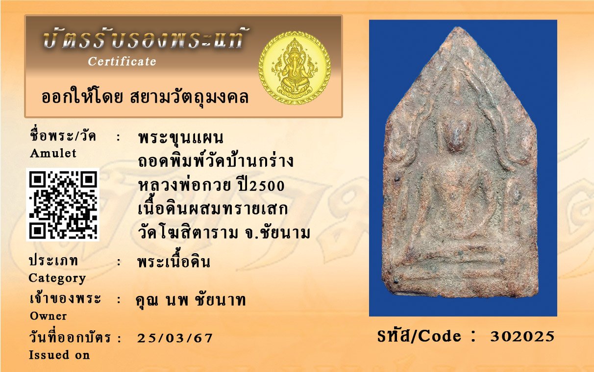 รหัสสินค้า : 302025 พระขุนแผน ถอดพิมพ์วัดบ้านกร่าง หลวงพ่อกวย ปี2500 เนื้อดินผสมทรายเสก วัดโฆสิตาราม จ.ชัยนาม