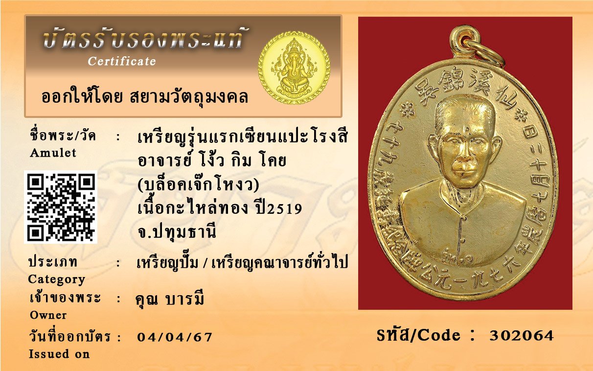 รหัสสินค้า : 302064 เหรียญรุ่นแรกเซียนแปะโรงสี อาจารย์ โง้ว กิม โคย (บล็อคเจ๊กโหงว) เนื้อกะไหล่ทอง ปี2519 จ.ปทุมธานี