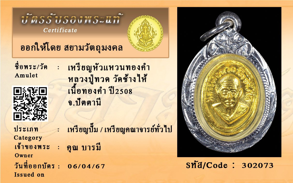 รหัสสินค้า : 302073 เหรียญหัวแหวนทองคำ หลวงปู่ทวด วัดช้างไห้ เนื้อทองคำ ปี2508 จ.ปัตตานี