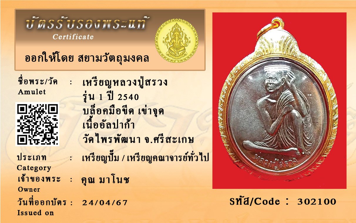 รหัสสินค้า : 302100 เหรียญหลวงปู่สรวง รุ่น 1 ปี 2540 บล็อคมือขีด เข่าจุด เนื้ออัลปาก้า วัดไพรพัฒนา จ.ศรีสะเกษ