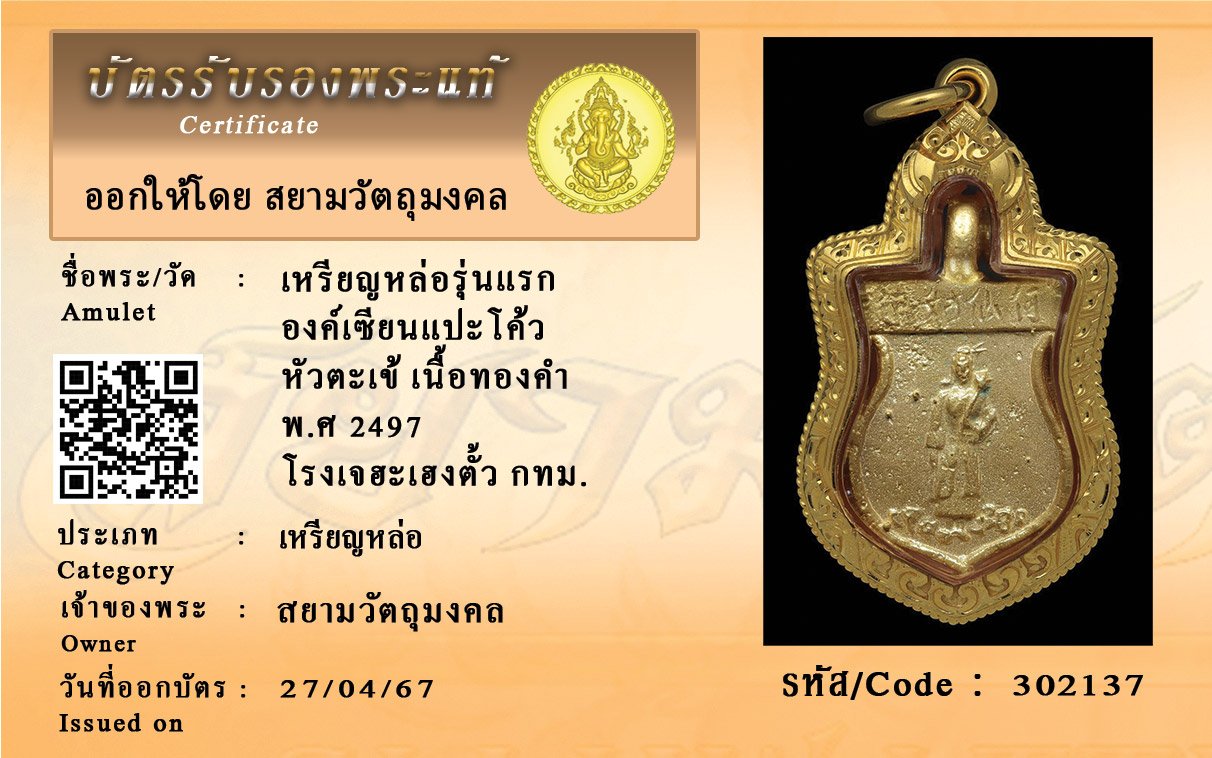 รหัสสินค้า : 302137 เหรียญหล่อรุ่นแรก องค์เซียนแปะโค้ว หัวตะเข้ เนื้อทองคำ พ.ศ 2497 โรงเจฮะเฮงตั้ว กทม.