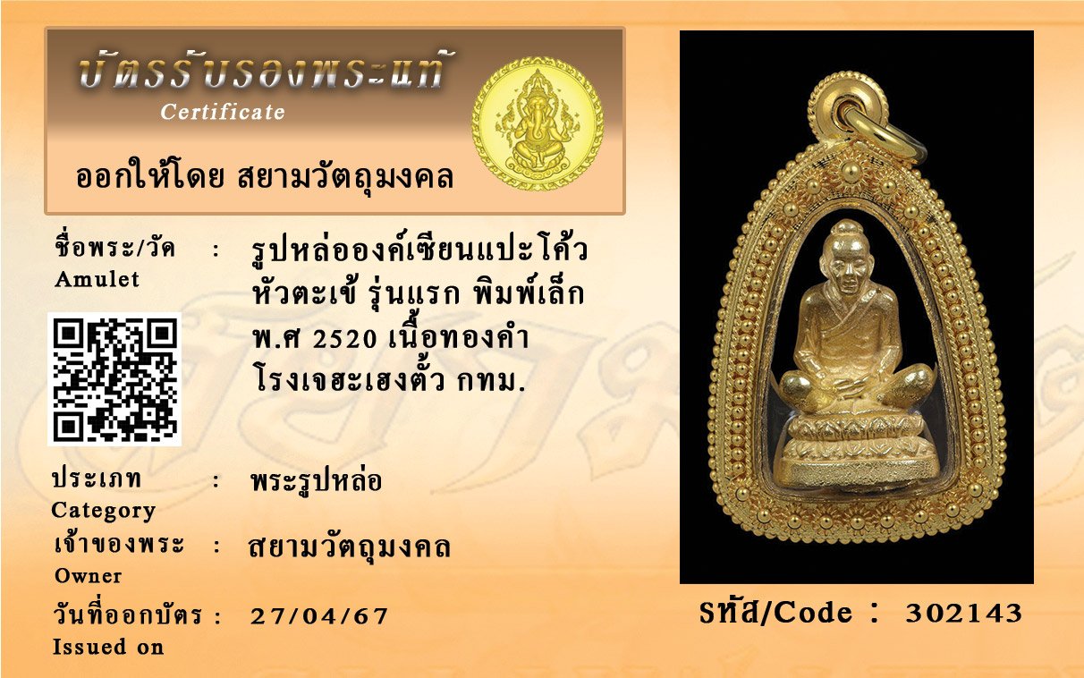 รหัสสินค้า : 302143 รูปหล่อองค์เซียนแปะโค้ว หัวตะเข้ รุ่นแรก พิมพ์เล็ก พ.ศ 2520 เนื้อทองคำ โรงเจฮะเฮงตั้ว กทม.